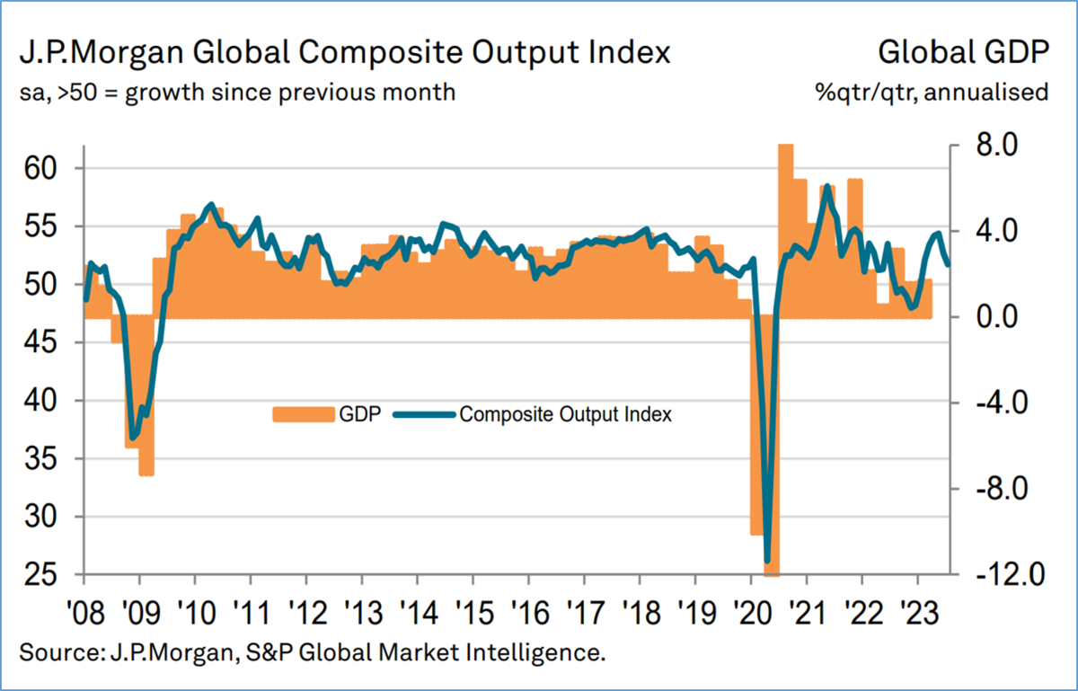 В мировой экономике доля услуг выше, чем доля промышленности. Несмотря на то, что деловая активность в промышленности падает (см. выше), за счёт сектора услуг глобальный композитный индекс деловой активности держится выше отметки в 50 пунктов.