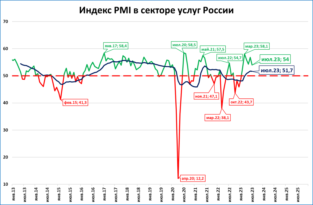 В июле индекс деловой активности в секторе услуг (PMI Services) составил 54 пункта.