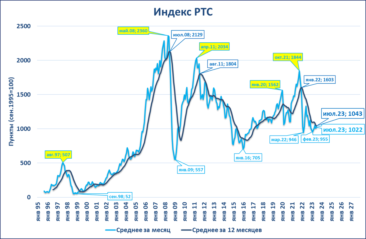 В сентябре 1997 года (в момент создания) индекс Мосбиржи был равен 100 пунктам. По итогам июля 2023 года индекс вырос до 3 тыс. пунктов, то есть в 30 раз (см. об индексе Мосбиржи выше).
