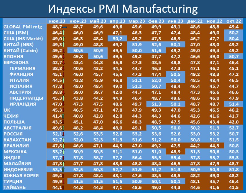 Красного цвета в таблице всё больше. Страны с ростом деловой активности можно пересчитать на пальцах одной руки.