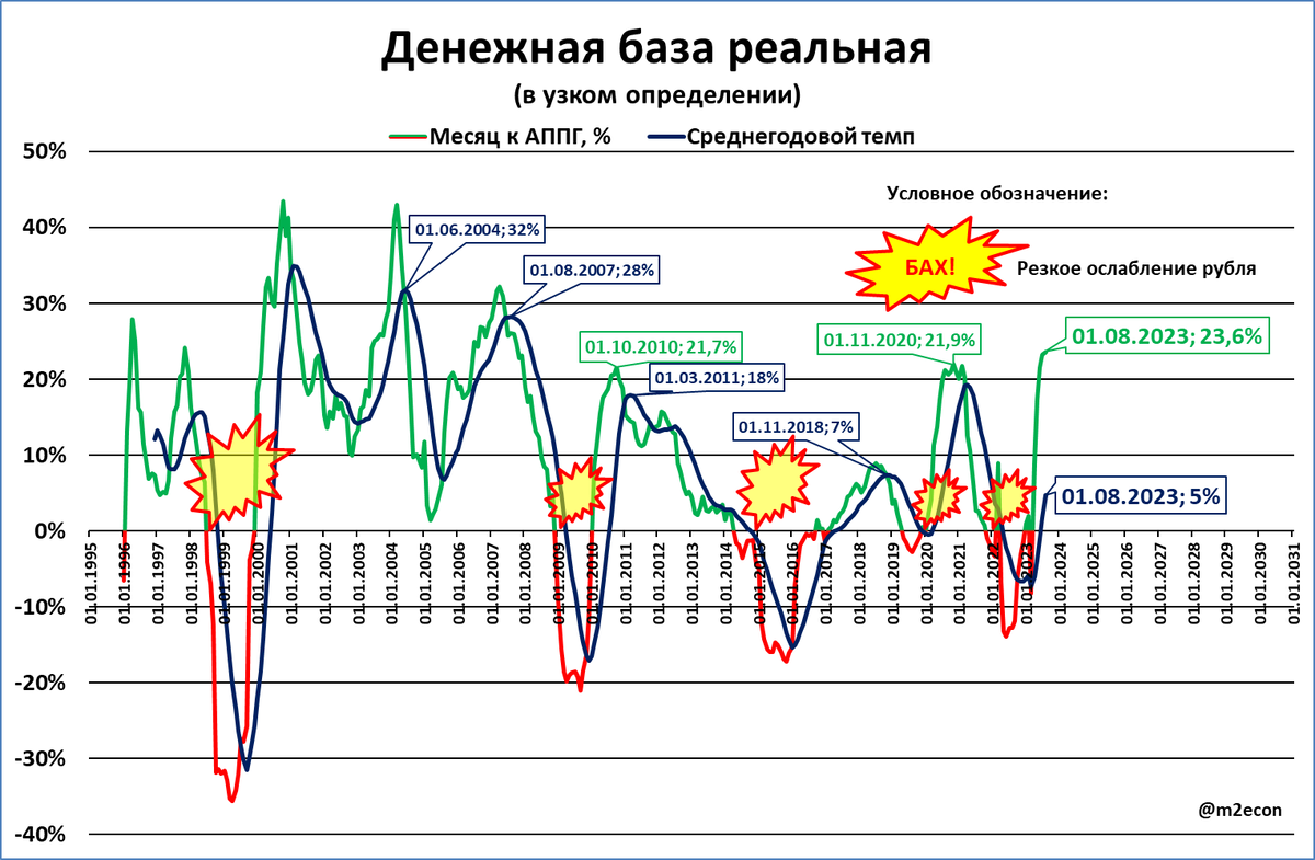 На графике темпов жёлто-красными всполохами обозначены моменты, когда рубль резко падал по отношению к доллару. Происходило это при замедлении роста реальной УДБ, когда синяя линия на графике шла вниз. Сейчас эта линия направлена вверх.