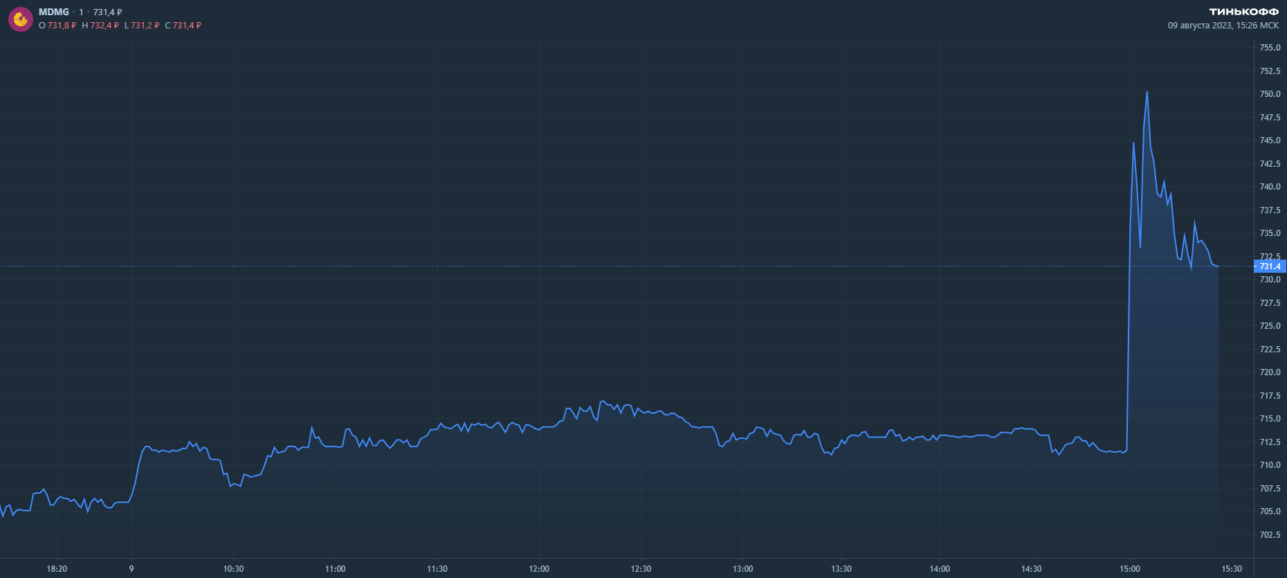 К 15:56 по мск бумаги MDMG торгуются по цене 731,4 руб за акцию (+3,6% от цены закрытия предыдущего дня).