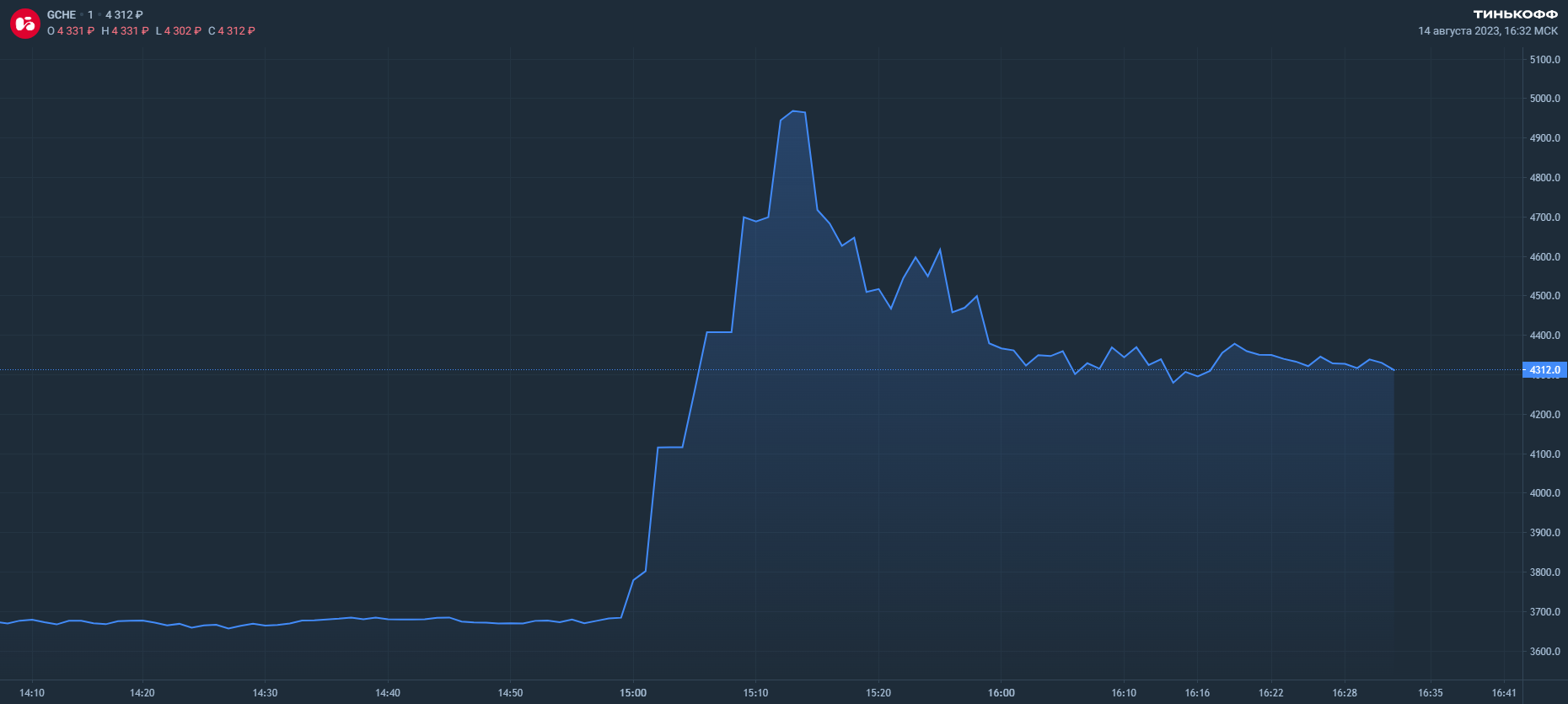 Сегодня группа компаний Черкизово, которая занимается производством мясных продуктов, объявила о предстоящем собрании совета директоров. Завтра 15 августа менеджмент компании обсудит вопрос о распределении прибыли акционерам по итогам второго квартала. На новости бумаги GCHE резко прибавили в цене. В моменте их рост достигал почти 40%, из-за чего биржа вводила дискретный аукцион и несколько раз меняла параметры динамических лимитов цен для заявок по бумаге.