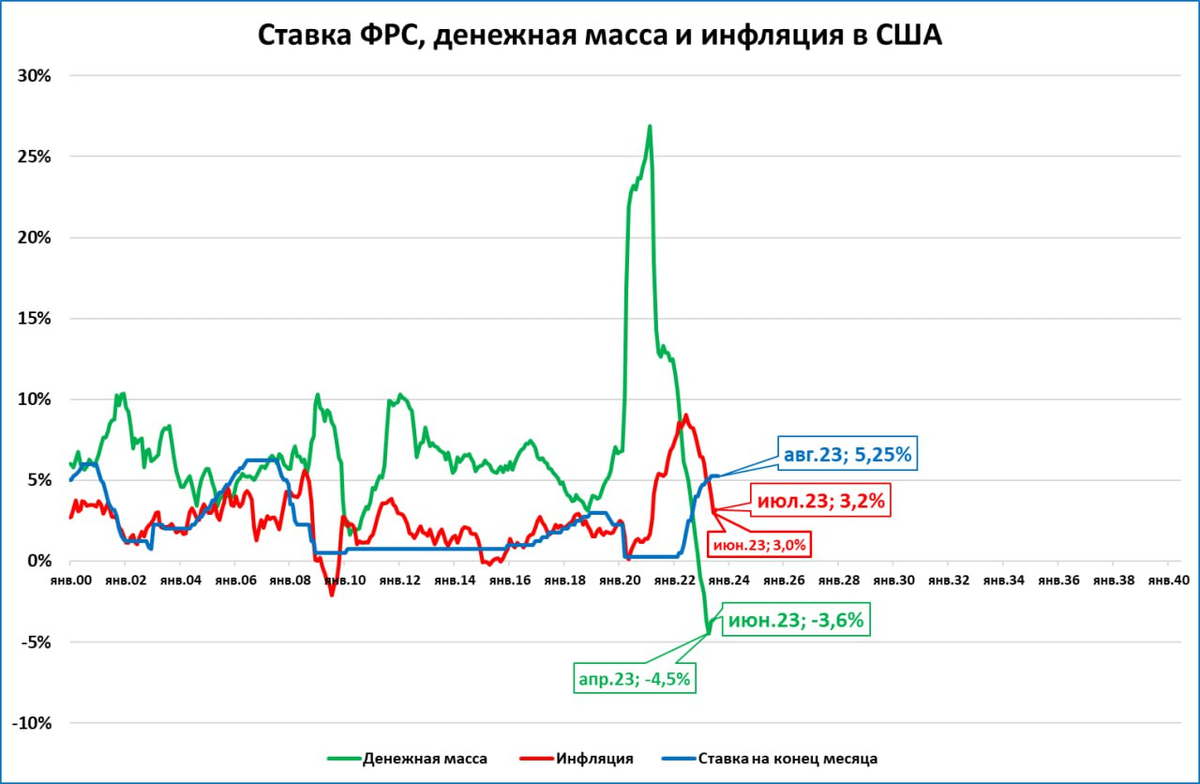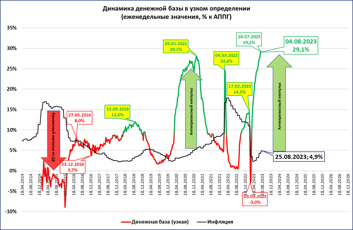 Для экономики важно соотношение инфляции с ростом денежной массы. В июне падение денежной массы незначительно (с -3,5 до -3,6%) замедлилось. Но это улучшение в 0,1 процентного пункта уже “съел” рост инфляции в июле на 0,2 процентных пункта.
