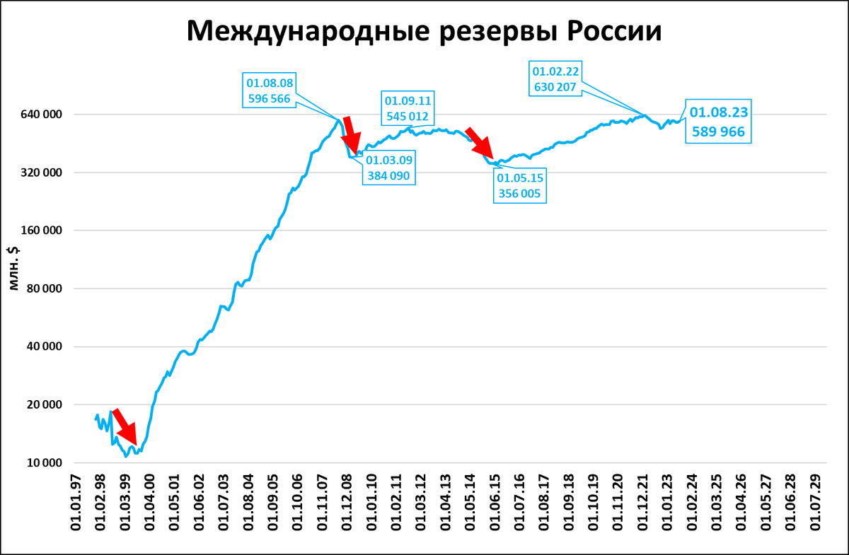 На 1 августа 2023 года международные резервы (проще говоря, ЗВР) России составили 590 млрд. в долларовом эквиваленте.