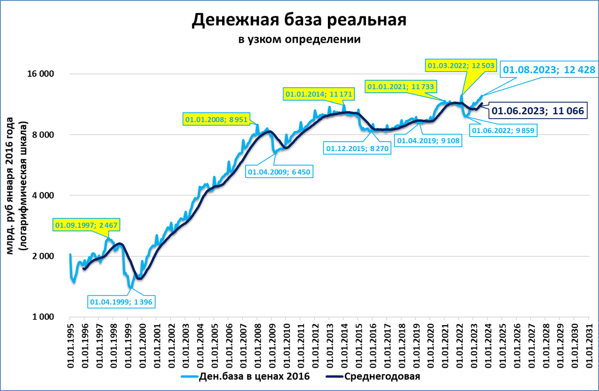 Нас, как всегда, интересуют показатели в реальном выражении. В постоянных ценах 2016 года УДБ на 1 августа самую малость не дотянула до исторического рекорда, установленного 1 марта 2022 года.