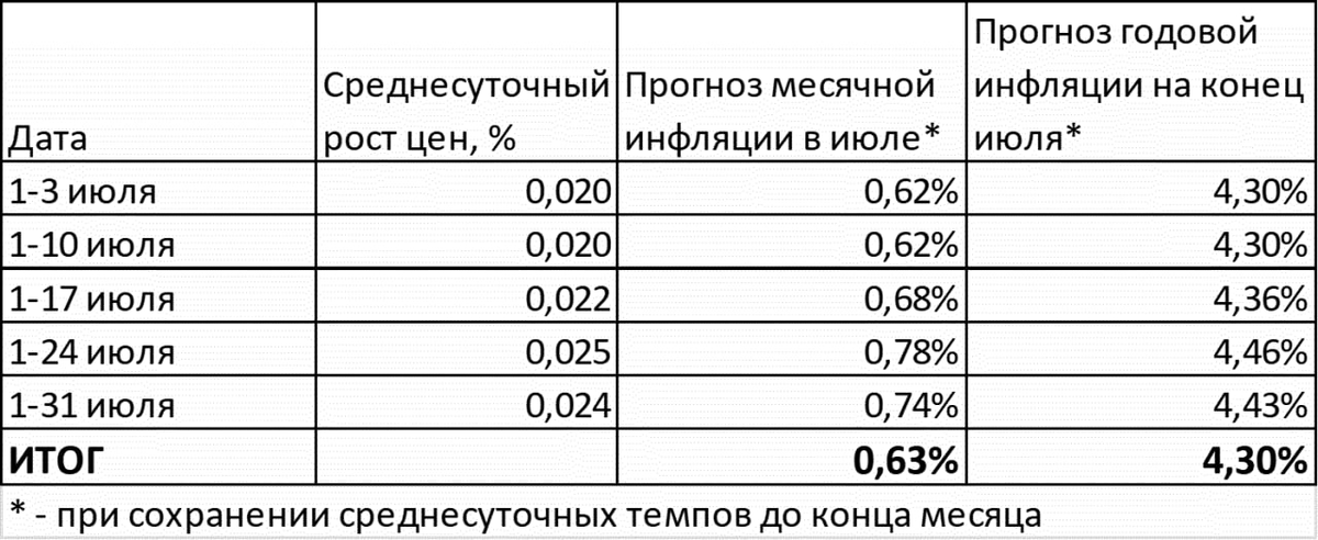 За последние три месяца (май-июль) инфляция росла в среднем на 0,44% за месяц. Если такой месячный рост цен продлится на ближайшие 12 месяцев, то