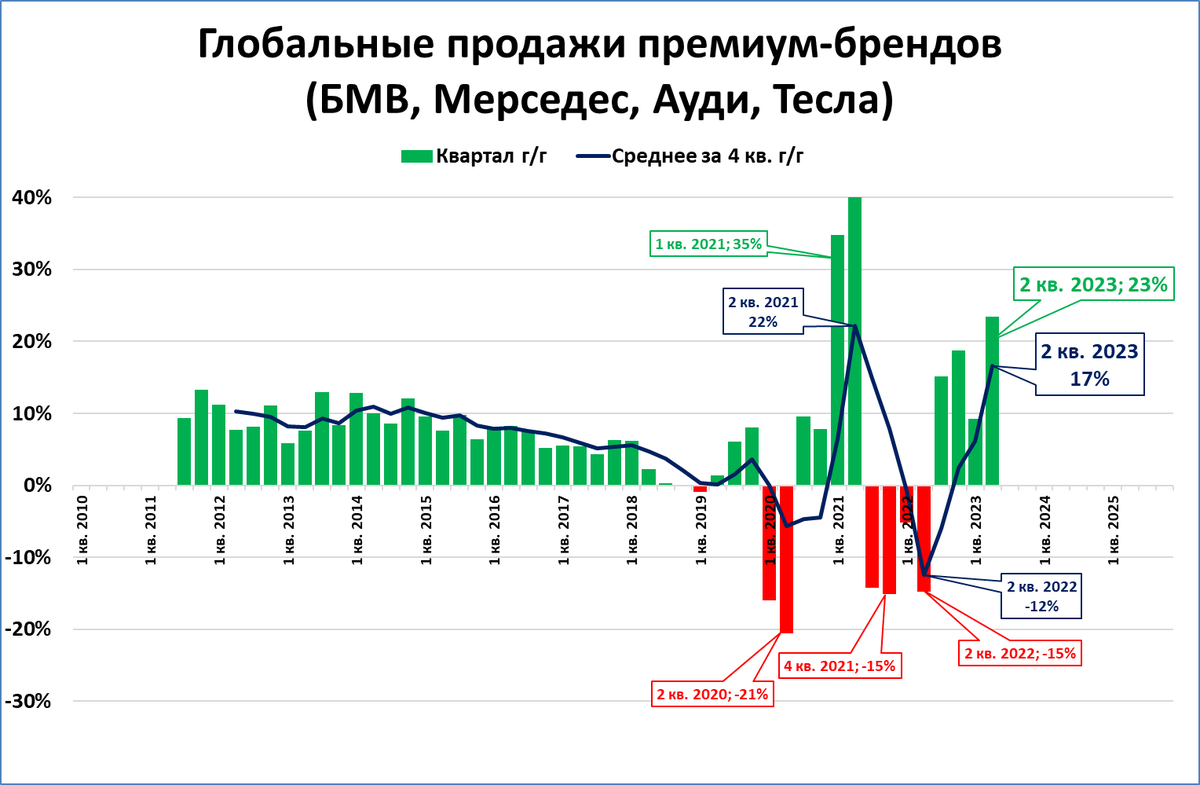 Сейчас эти продажи ставят очередные исторические рекорды. Так, во втором квартале 2023 года впервые было продано более 2 млн. премиум-автомобилей*.