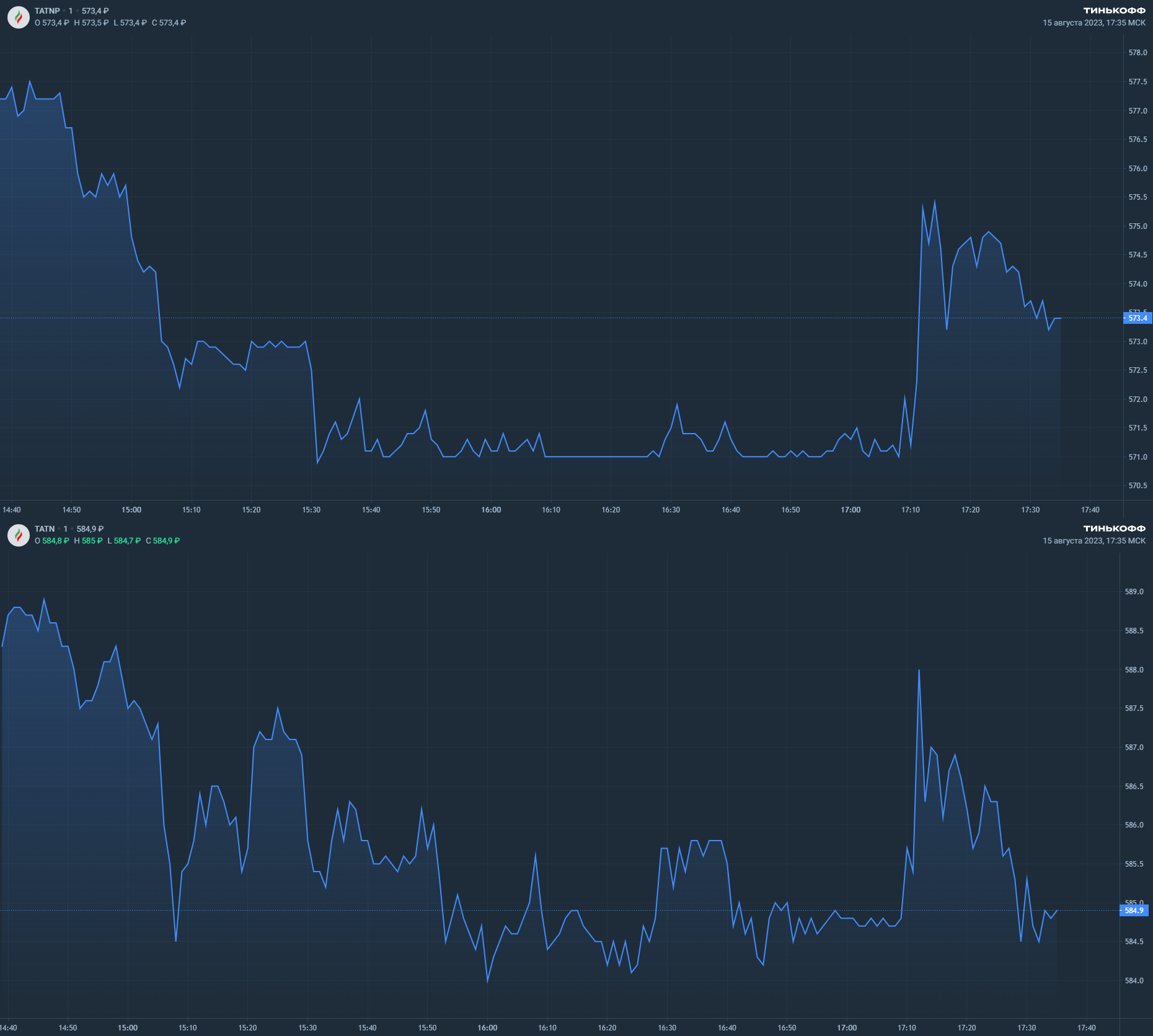 К 17:35 по мск TATN торгуются на уровне 584,9 руб за акцию. Префы TATNP — 573,4 руб за бумагу.