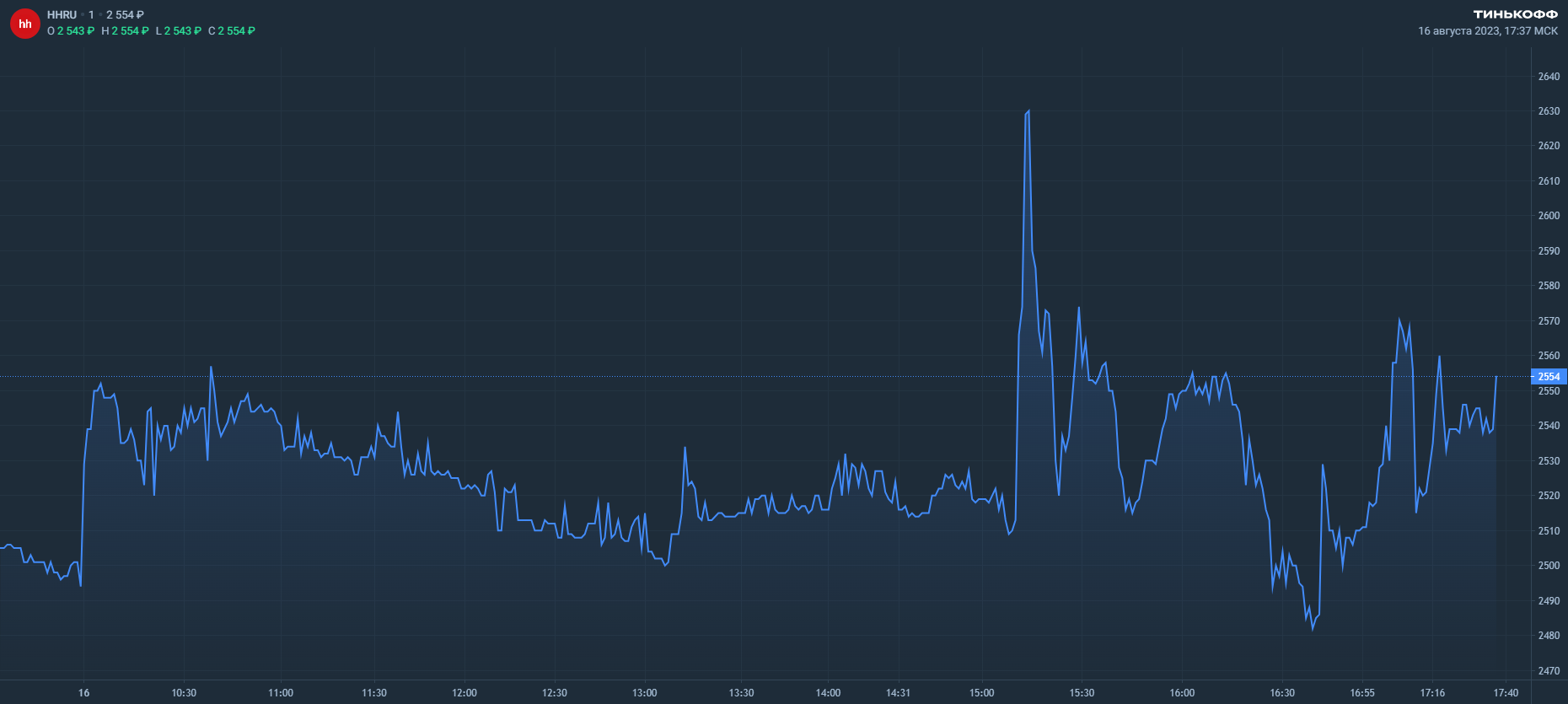 К 17:37 по мск бумаги HHRU торгуются по цене 2553 руб (+2,37% от закрытия прошлой сессии).