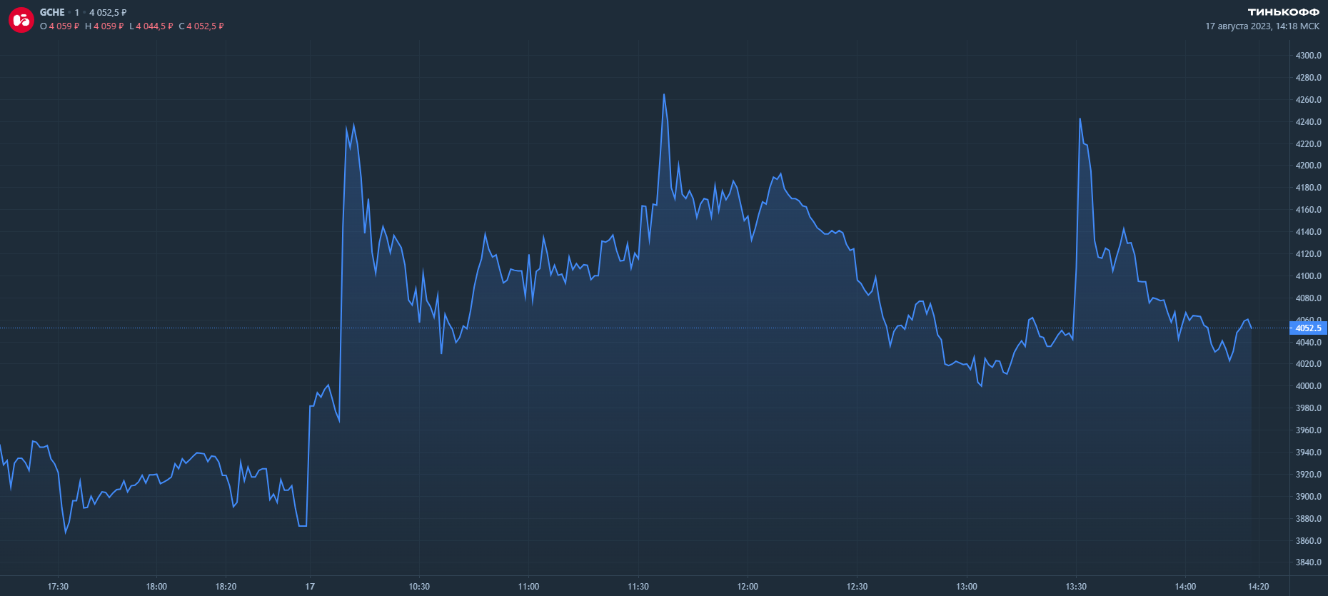 К 14:18 по мск GCHE торгуется по цене 4052,5 руб за акцию (+4,63%).