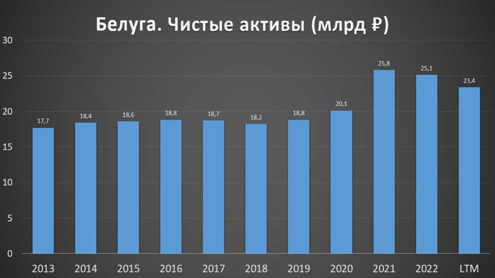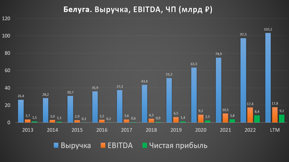На годовом горизонте виден хороший рост финансовых результатов. Темпы роста выручки за последние пять лет около 20%, EBITDA около 30%, а чистой прибыли около 60%. Правда, не будем забывать, что чистая прибыль 2022 года и LTM (за последние 12 мес) содержат в себе разовый доход от продажи международных прав на бренд Белуга в размере 1,1 млрд. В этом году этого дохода не будет.