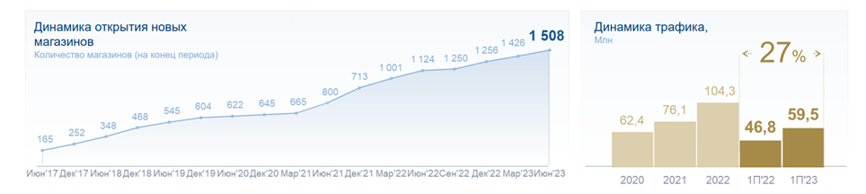 Также нужно отметить позитивную динамику открытия новых магазинов Винлаб. Количество торговых точек за полугодие возросло на 11,5%, превысив отметку 1 500 магазинов. Вырос как трафик, так и средний чек. Благодаря этому, объем продаж по сравнению с аналогичным периодом 2022 года увеличился на 33%. «ВинЛаб» обретает все большую значимость для группы, становясь одним из основных драйверов ее развития.