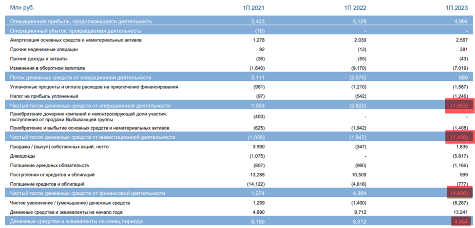 от операционной деятельности -2 млрд. Т.е. за полгода у компании случился отток денег, хотя год назад был приток в размере 1млрд. Основные причины - это рост запасов и уменьшение кредиторской задолженности больше, чем дебиторской.