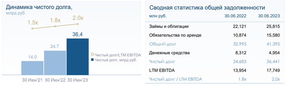 Кредиты и займы наоборот подросли почти на 16%. Таким образом, чистый долг вырос почти в 1,5 раза до 36,4 млрд. ND/EBITDA = 2. Это уже выше среднего и видим отрицательную динамику. Правда, чистый долг здесь учитывает обязательства по аренде, которые составляют 40% от него. Без них ND/EBITDA = 1,2. Т.е. компания имеет хорошую финансовую устойчивость.