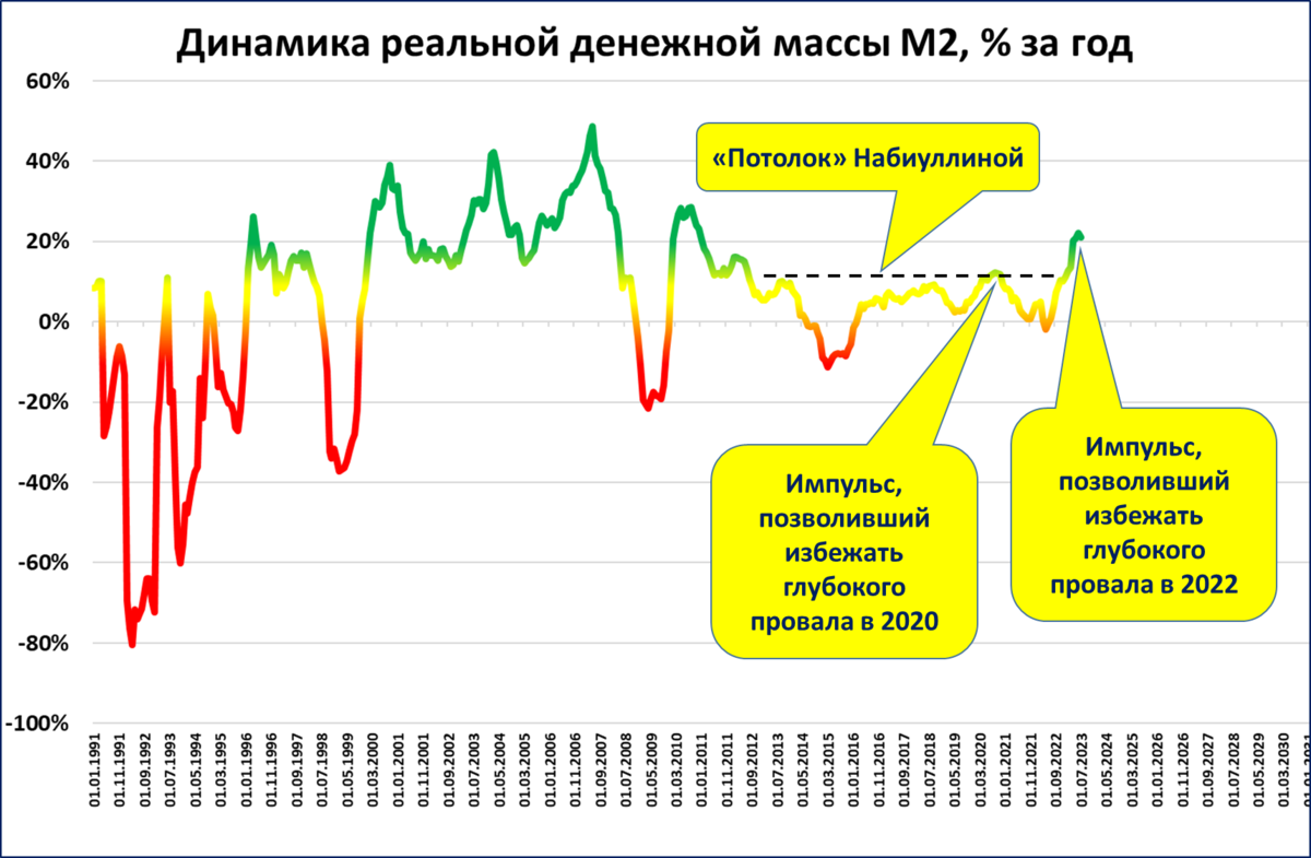 Импульс СВО. Следующая и более удачная попытка пробить потолок произошла в 2022 году, уже после начала СВО. Этот импульс оказался настолько мощным, что "потолок Набиуллиной" оказался, наконец, пробит. Реальная денежная масса вышла в "зелёную" зону высоких темпов роста ВВП.