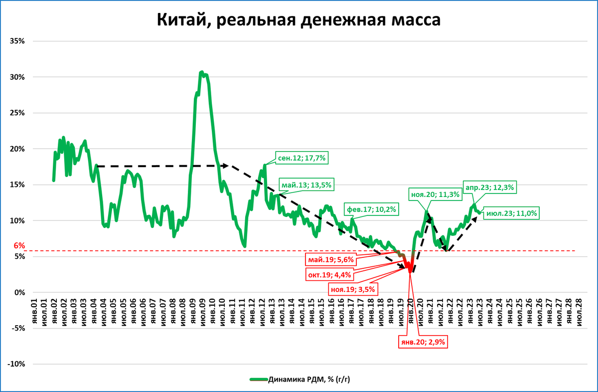Первое полугодие показало рост +5,5% к первому полугодию прошлого года. Это при том, что компартия Китая поставила цель +5% в 2023 году.