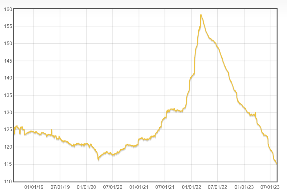 Прошлый год был неплохим. Но на графике видно, что индекс мировых цен на алмазы с пиков 2022 года снизился на 27%. Текущие цены самые низкие за последние 5 лет.