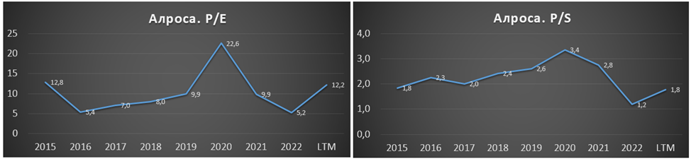 На квартальной диаграмме видим, что 1Q-2Q 2022 года получились отличным, т.к. цены на алмазы были высокими. И в целом, несмотря на падение цен на алмазы, результаты 1Q-2Q 2023 достойные, основная причина – это девальвация рубля. А если бы не дополнительный разовый НДПИ в размере 15,4 млрд, то результаты были бы значительно лучше. Кстати, на диаграмме ориентировочно указаны результаты за 3Q-4Q 2022, из которых достоверно известно, что за второе полугодие был получен убыток 2,4 млрд. Правда, не известно, по каким причинам, вероятно, какие-то бумажные переоценки.
