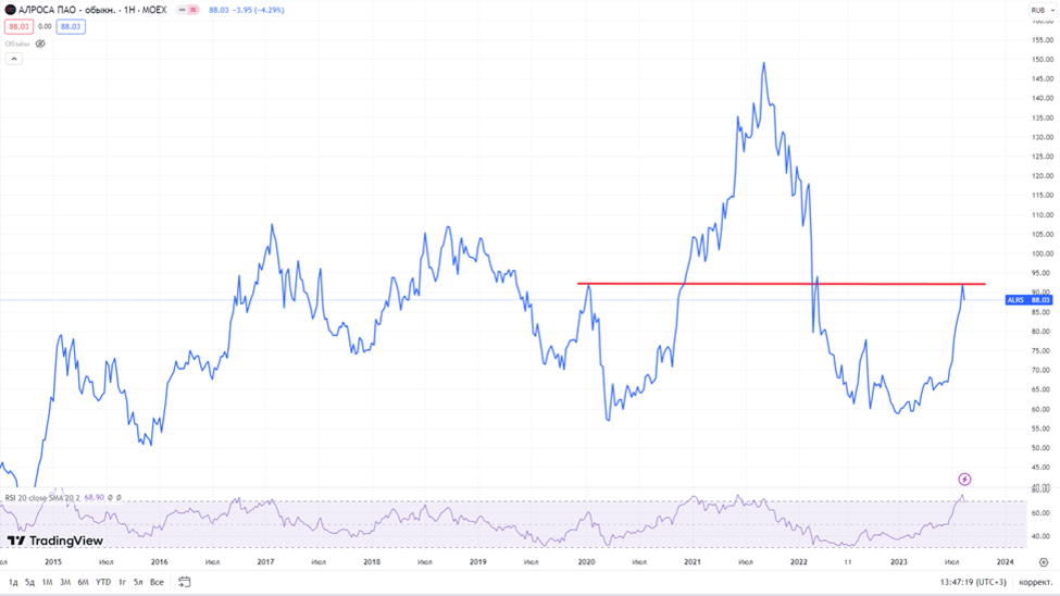 Акции сначала года выросли на 50%. Для текущей ситуации цена акций выглядит справедливой. Но если компанию не будут сильно обдирать налогами, и АЛРОСА вернется к выплате дивидендов, то можно ожидать возврата котировок к уровню 100₽.