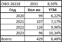 За неполных четыре года инвестор купит 429 облигаций, доходность к погашению на 01.08.2023 всего портфеля будет равна 8,48%. Самая удачная покупка совершена в марте 2023 – YTM= 14,08%, самая неудачная — в июне 2020 – YTM=5,62%. Результаты по календарным годам – в таблице.