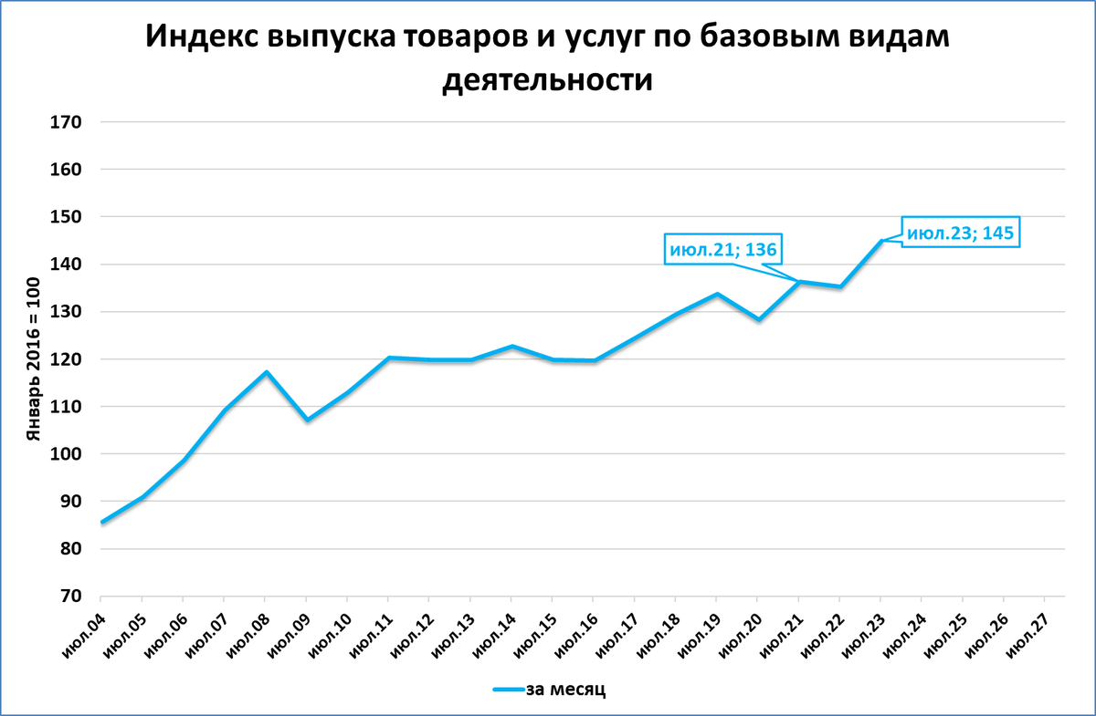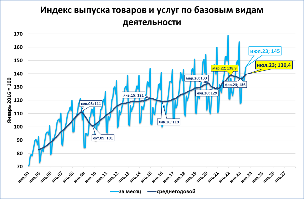 Выпуск по базовым видам деятельности считается в постоянных ценах и отражает ситуацию в отраслях, охватывающих примерно 60% ВВП. Это, кроме промышленного производства, ещё и сельское хозяйство, строительство, транспорт, оптовую и розничную торговлю.