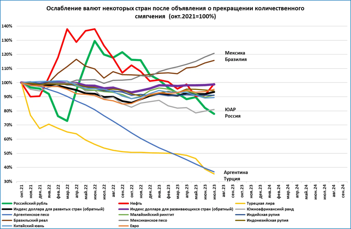 Ослабление турецкой лиры тоже не способно помешать росту. Как видно на графике лира (вместе с аргентинским песо) относится к валютам, которые просели сильнее всех по отношению к доллару США.