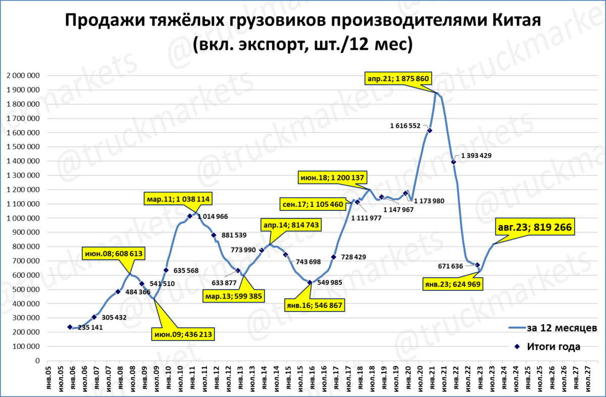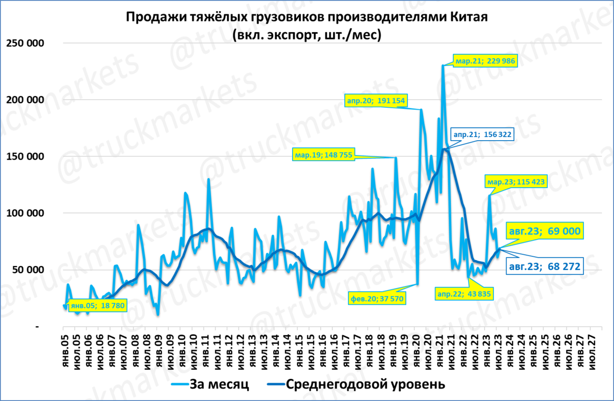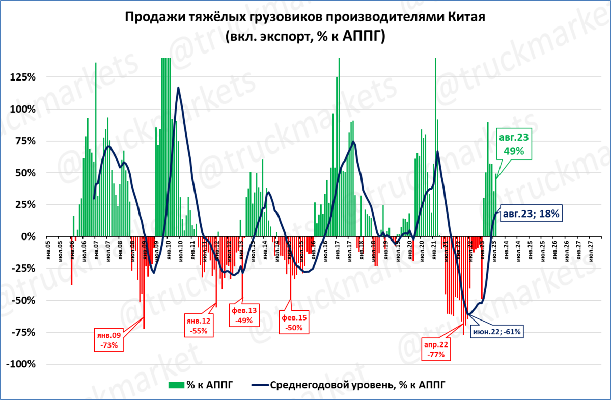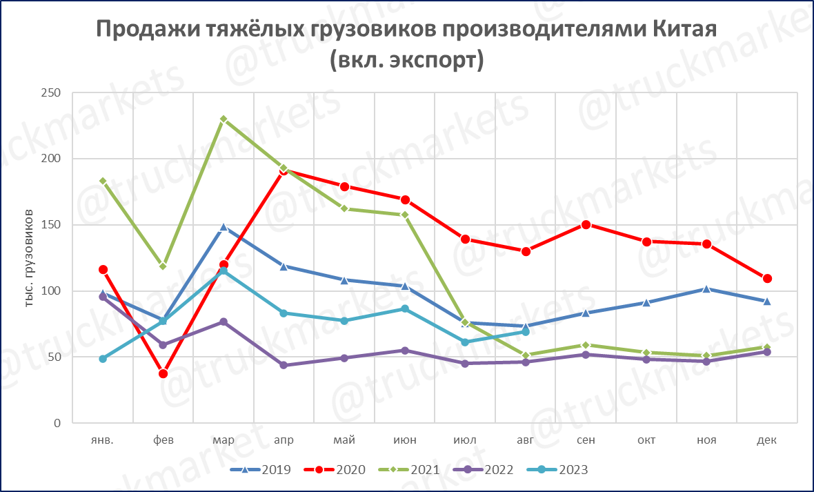 Продажи грузовиков китайскими производителями в августе выросли на 49% (включая экспорт) – это лучший август за 3 года.