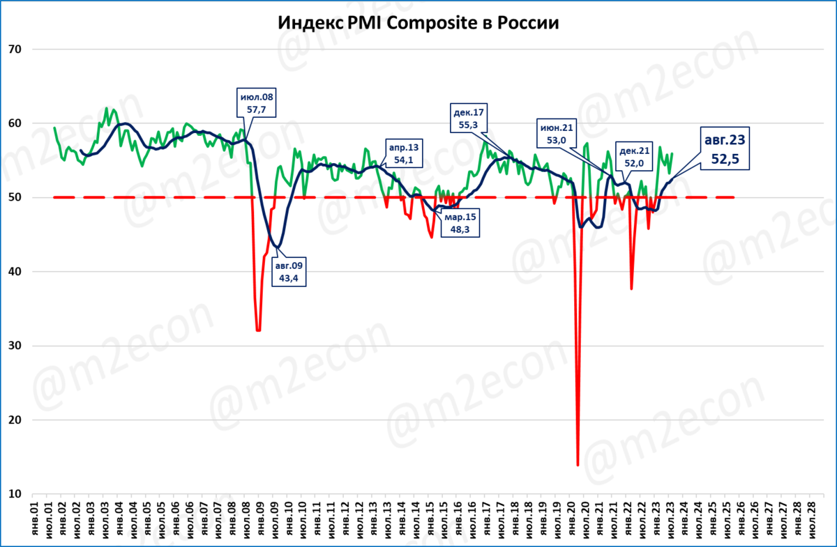 Напомним, что индекс выше 50 пунктов означает рост деловой активности, а ниже 50 пунктов – спад.