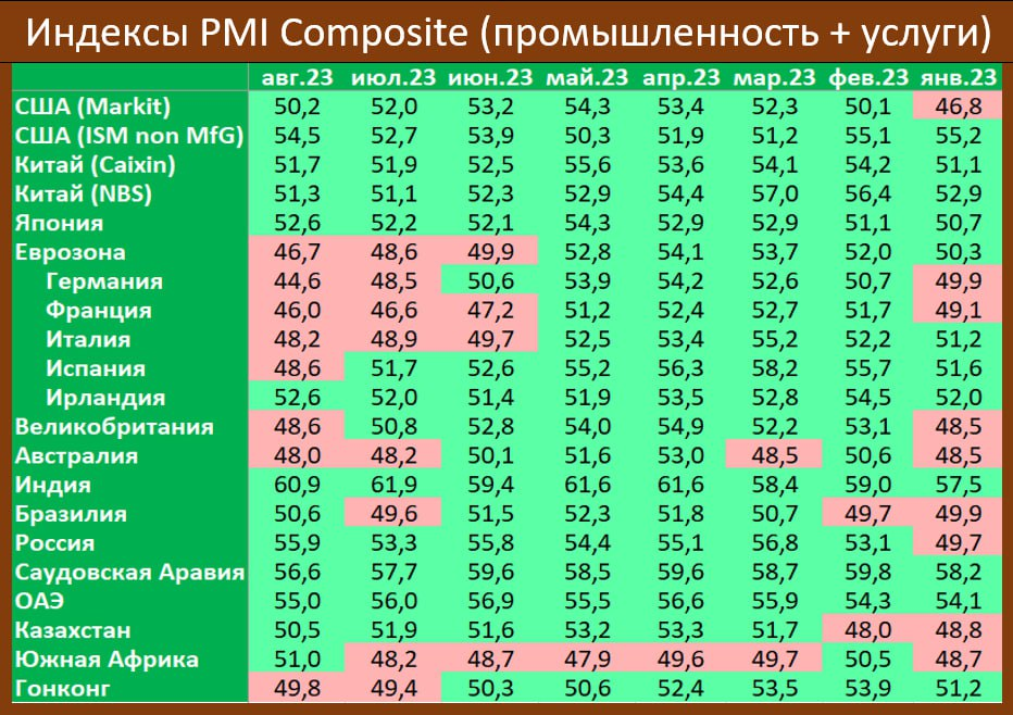 Композитный индекс по мировой экономике в целом (Global Composite Index) в августе снизился до 50,6 пункта. Он отражает ситуацию в экономике в целом (учитывает и промышленность, и услуги). От падения (ниже 50 пунктов) индекс спасает сектор услуг.