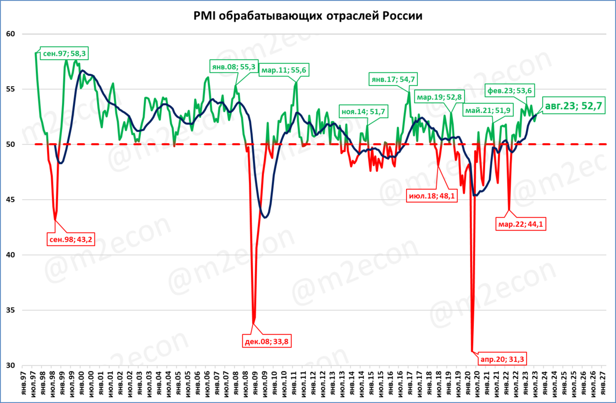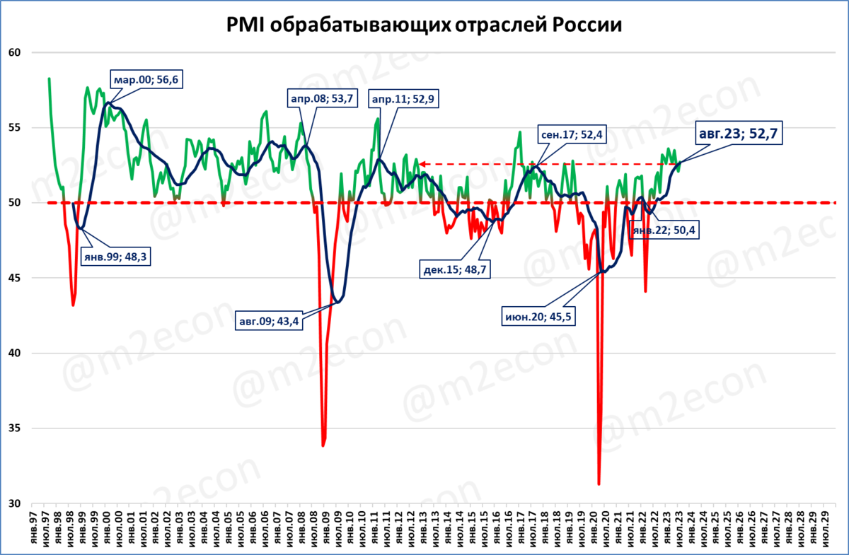 Важно сравнение с 2021 годом. Тогда индекс лишь в мае достигал высоких значений, а затем снижался и даже ушёл ниже критической отметки в 50 пунктов (см. выноску в ноябре 2021 года).