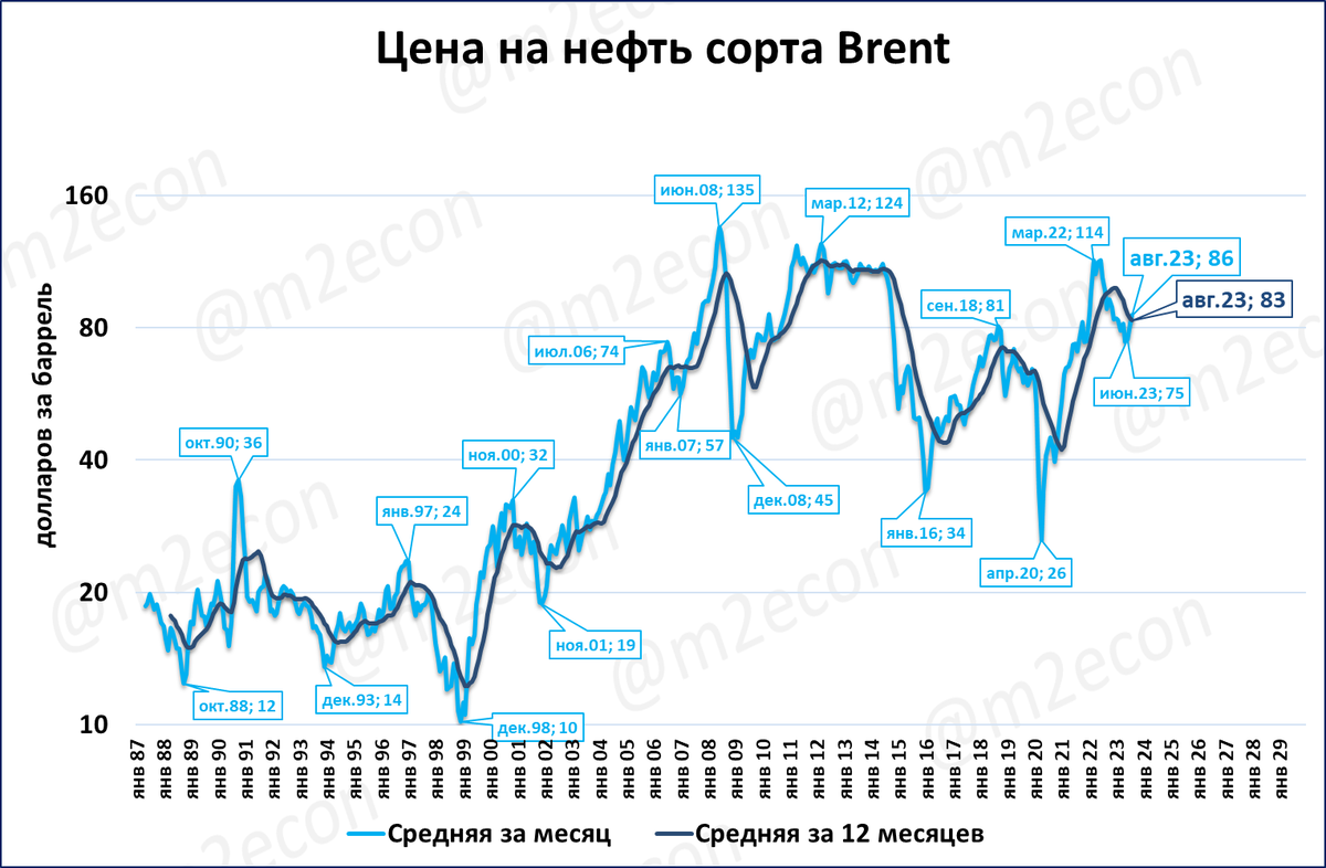 Брент: 86 доллара за баррель (-12% годовых)