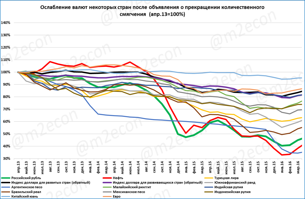Когда ФРС весной 2013 года объявила о предстоящем в 2014 году сворачивании количественного смягчения, валюты развивающихся стран отреагировали на это снижением.