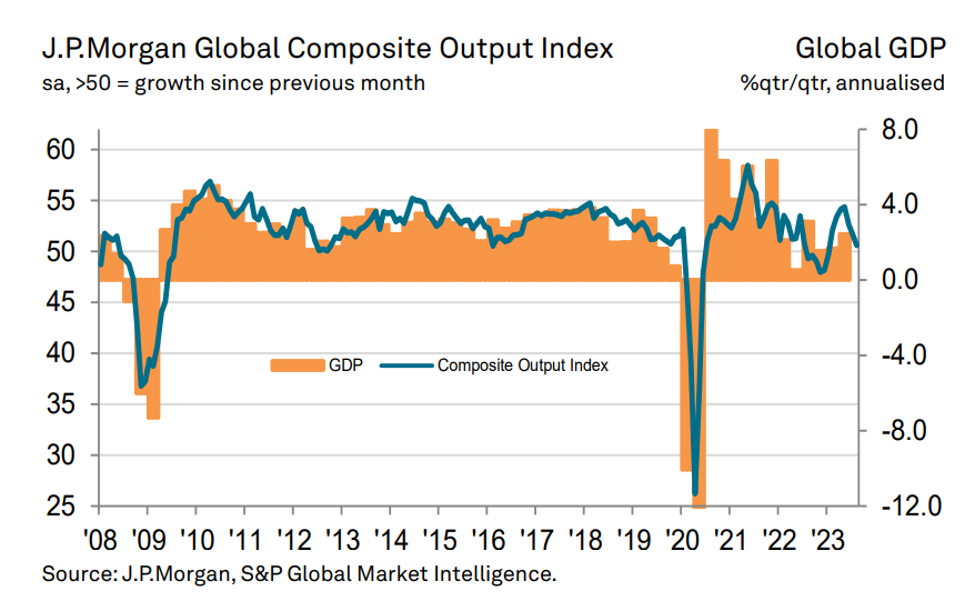 Деловая активность в секторе услуг пока позволяет глобальному композитному индексу (учитывает промышленность и услуги) находиться в зоне роста (выше 50 пунктов).