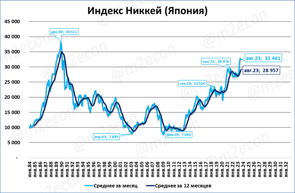 В августе индекс японского фондового рынка Никкей находился на отметке 32 461 пунктов, вблизи многолетних (с 1989 года) максимумов.
