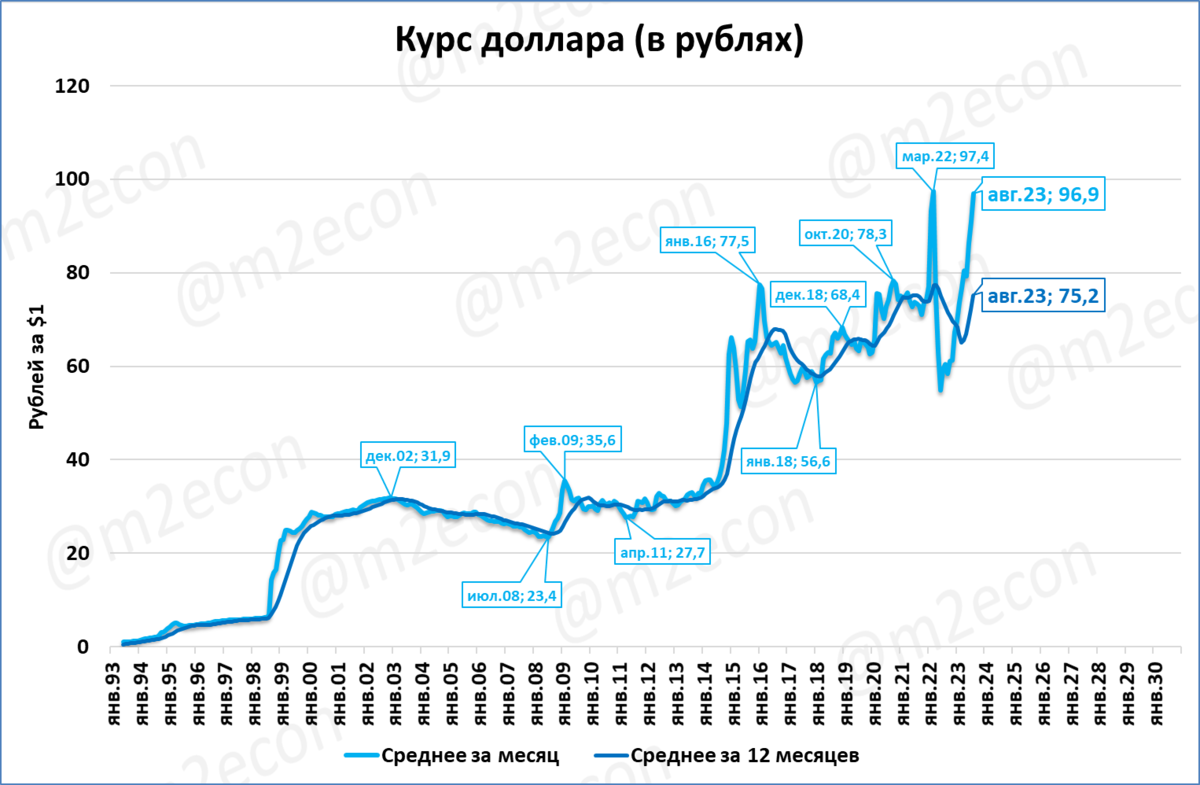 В августе средний курс составил 96,6 рубля за доллар.