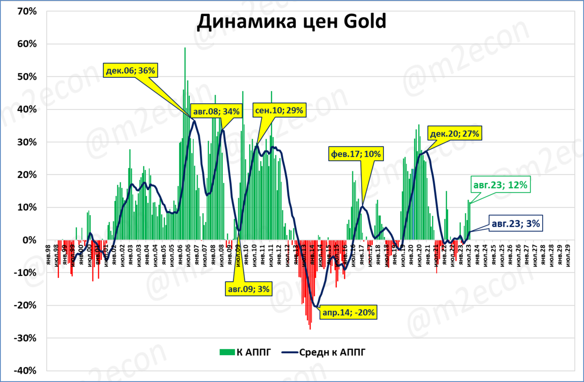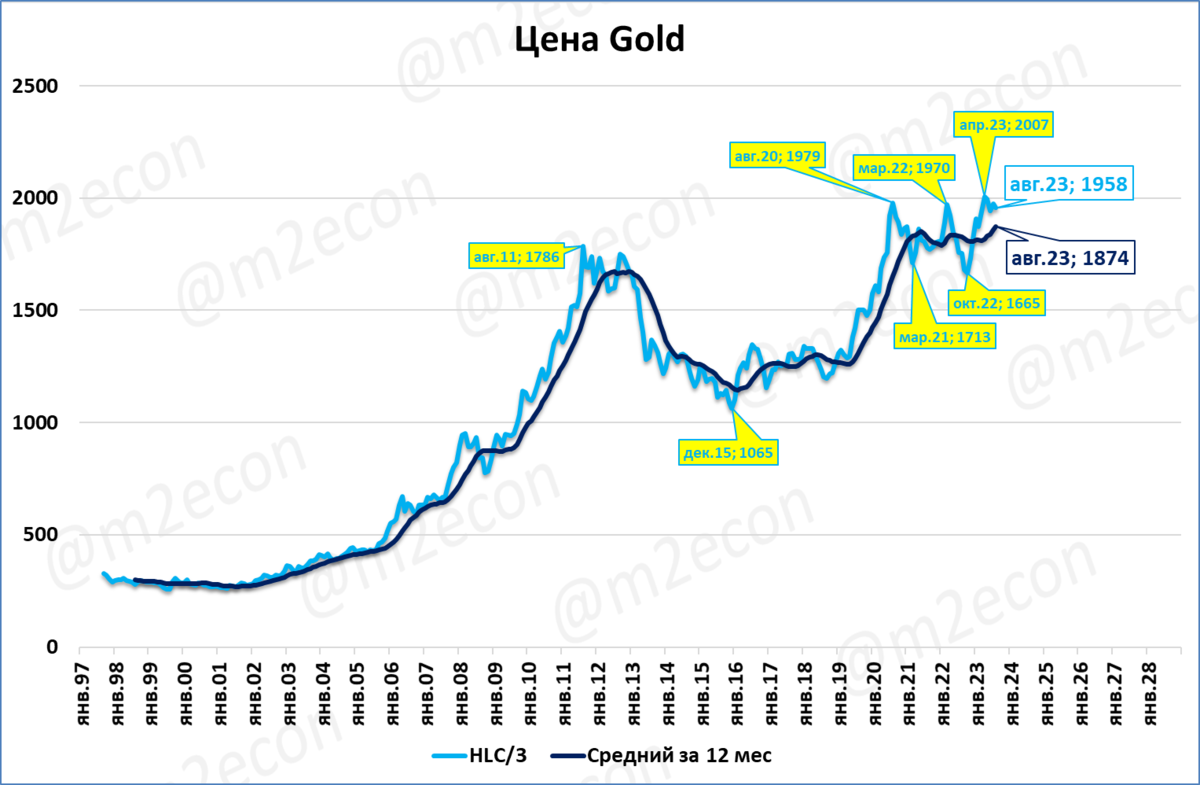Как следствие, среднегодовые цены на золото (тёмно-синяя линия) выходят из узкого диапазона 1780-1860 долларов, в котором находились с января 2021 года.