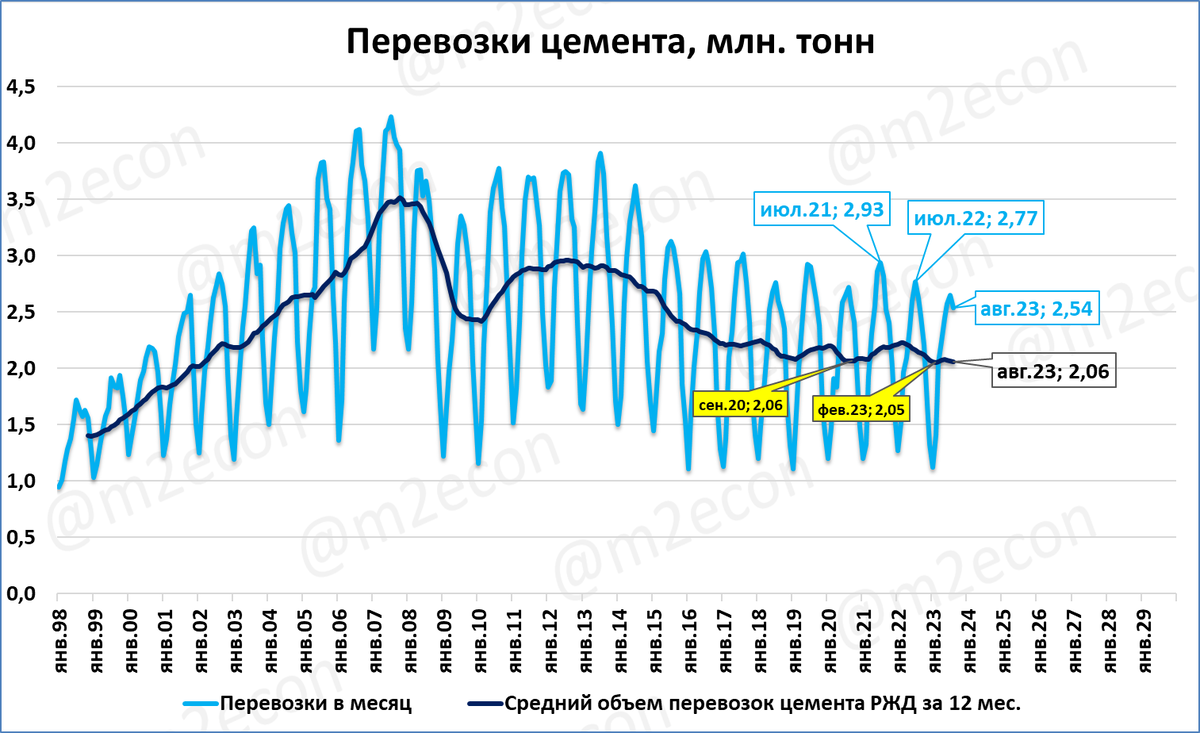 В августе по предварительной оценке было перевезено около 2,54 млн. тонн цемента.