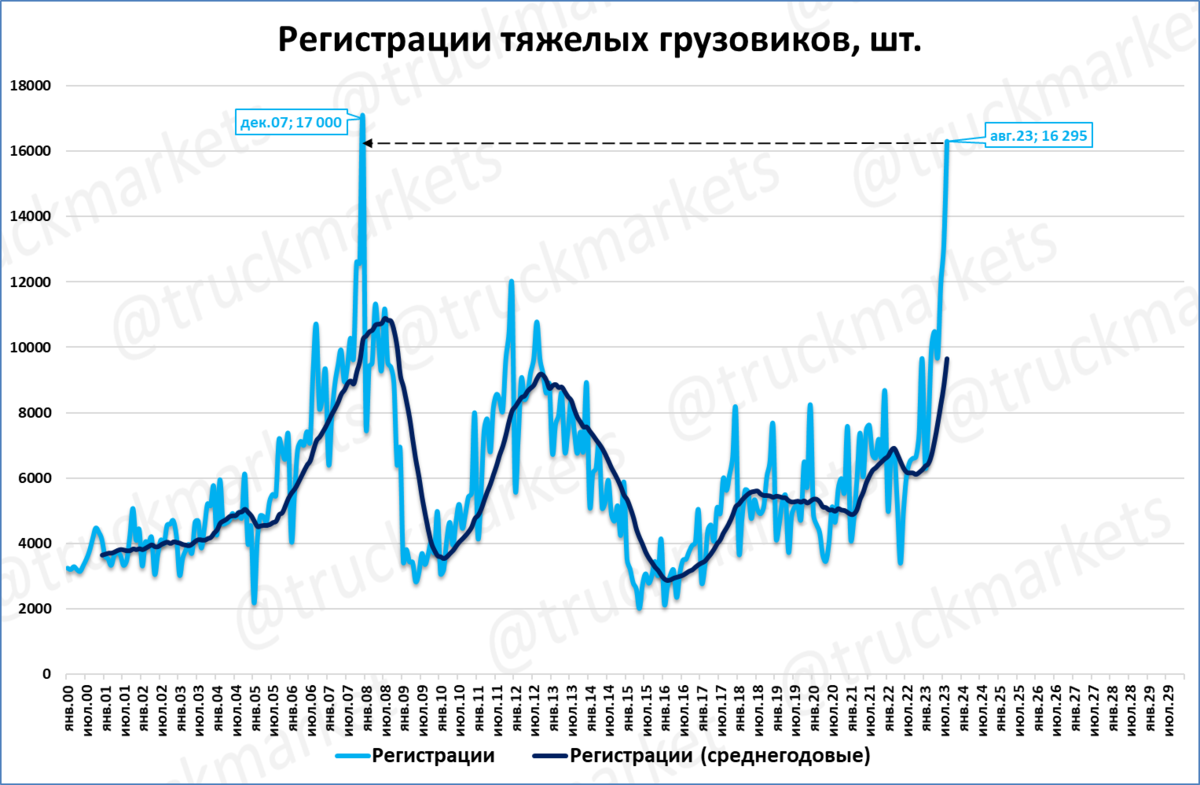 Рынок грузовиков в августе стал лучшим месяцем с декабря 2007 года (за 16 лет). Впервые с того времени рынок поднялся выше отметки в 16 тысяч.