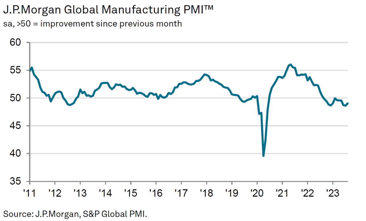 Индекс Global Manufacturing PMI уже двенадцатый месяц подряд остаётся ниже 50 пунктов, что означает снижение деловой активности.