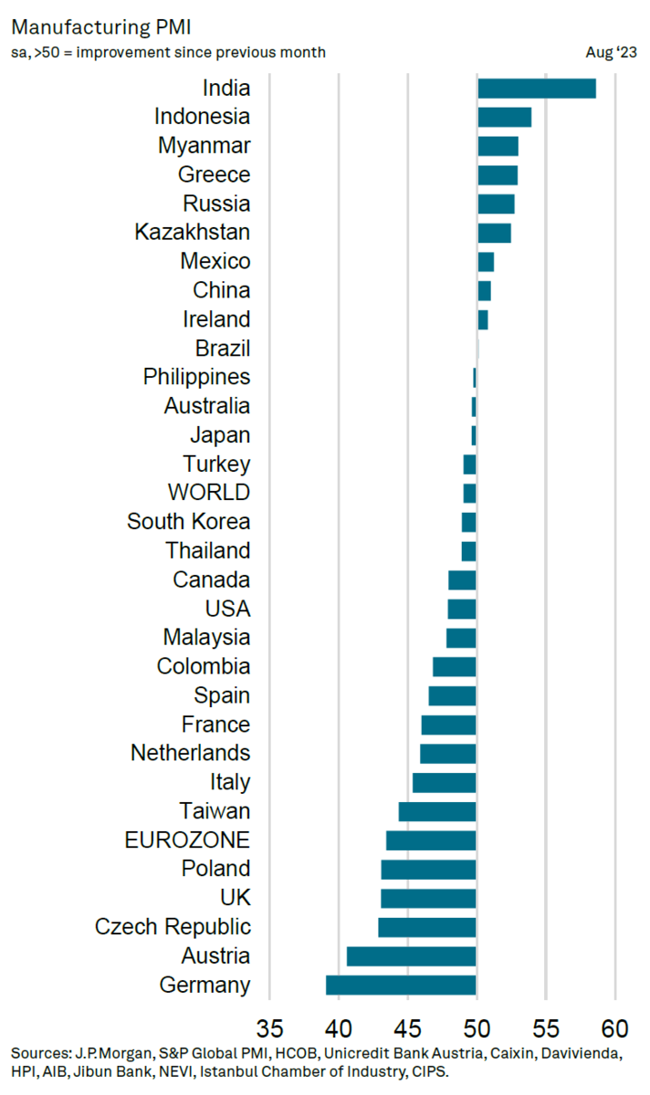 Cреди стран, где индекс выше 50 пунктов (= растёт деловая активность в промышленности) преобладают так называемые “страны с развивающимися рынками” (Индия, Индонезия, Россия, Китай, Казахстан).