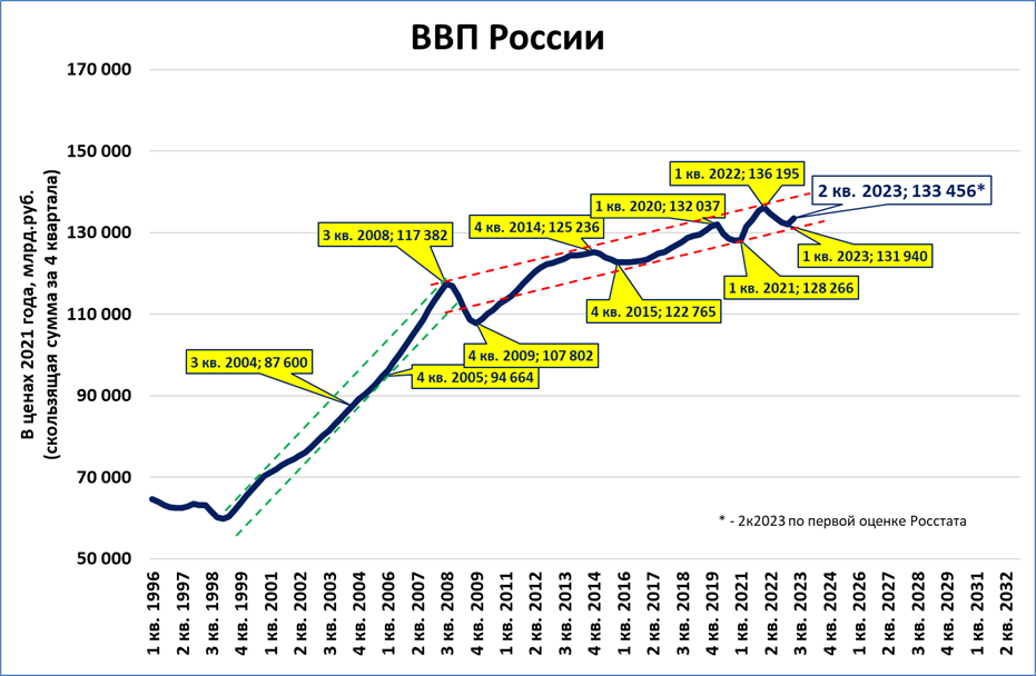 Если во 2 и 3 квартале рост ВВП сохранится на уровне 4,9% годовых, то по итогам 2023 года ВВП достигнет 136,9 трлн рублей* и установит новый исторический рекорд.