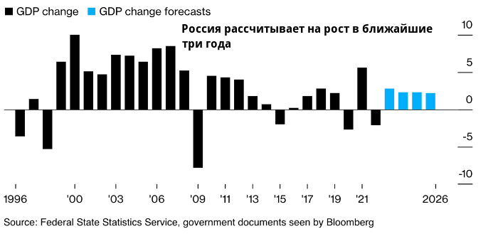 Согласно макроэкономическому прогнозу до 2026 г., который обсуждался в пятницу на заседании правительства под руководством премьер-министра Михаила Мишустина и с которым ознакомилось агентство Bloomberg News, в ближайшие два года темпы роста валового внутреннего продукта России снизятся до 2,3% с 2,8% в 2023 г. В дальнейшем ожидается снижение темпов роста ВВП до 2,2% в 2026 году.
