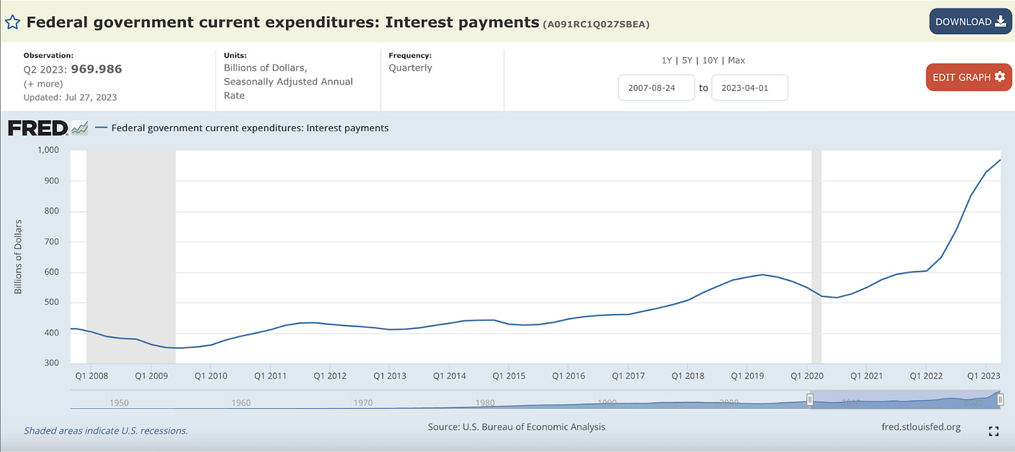 Растущий дефицит должен финансироваться за счет продажи все большего количества облигаций. К концу года Казначейство США должно продать облигаций дополнительно на сумму 1,85 трлн долларов, чтобы погасить старый долг и покрыть дефицит бюджета. И в дополнение к необходимости выпускать эти облигации, ФРС повышает ставки, что, в свою очередь, увеличивает размер процентов, которые должно выплачивать Казначейство США.