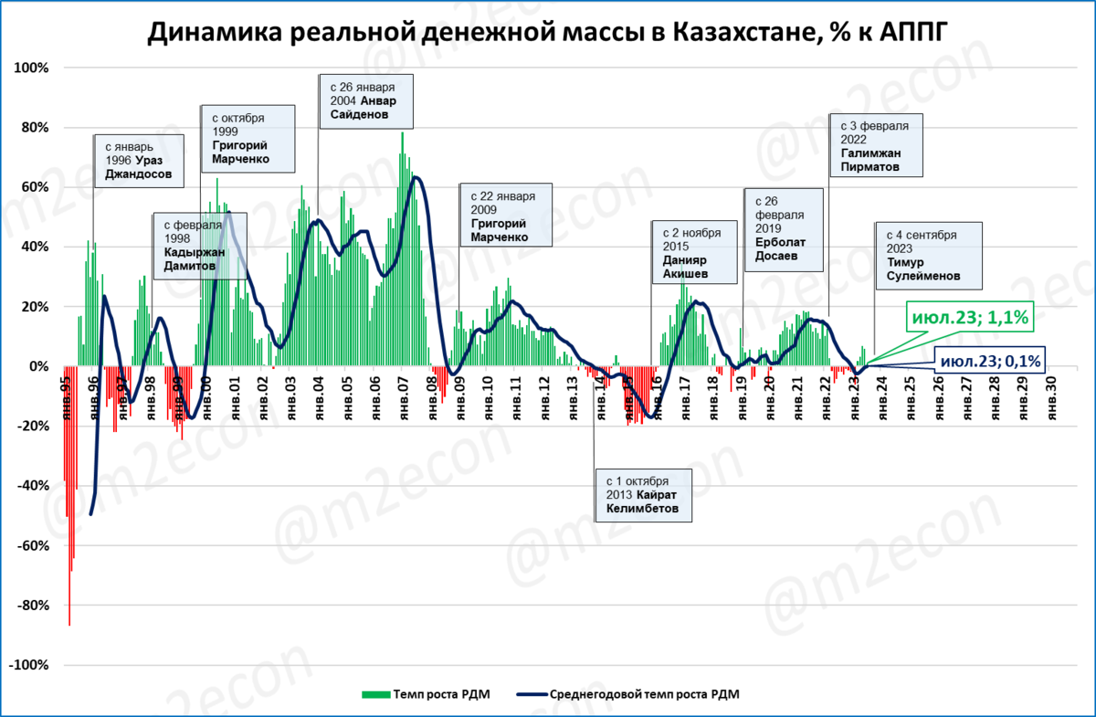 Сменившему его на посту главы ЦБ Галимжану Пирматову достаточно было всего лишь поддерживать рост реальной денежной массы. Но он это дело, к сожалению для Казахстана, провалил. И опять попал в зону риска увольнения. Об этом мы написали в марте. Но он продержался ещё целых полгода, пока его уволили.