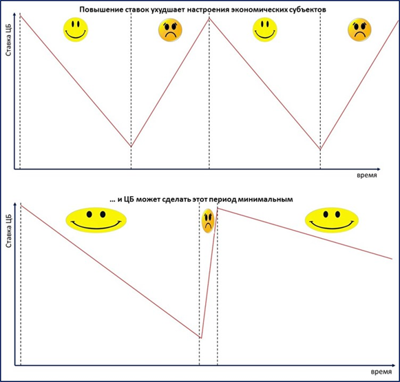 Идея проста: Сокращая период подъёма ставок, ЦБ уменьшает время пессимизма в экономике. Но для этого ставки надо поднимать решительно, с запасом, а не "отрубать хвост по частям".