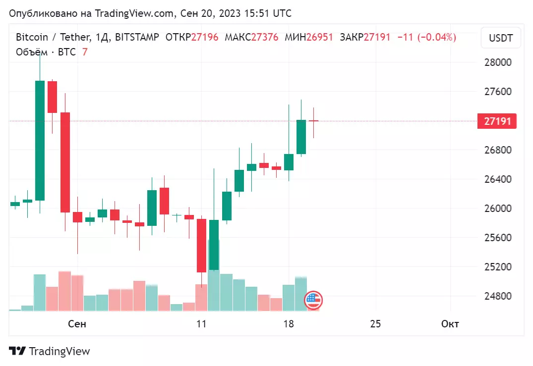 Рыночная стоимость биткоина днем 20 сентября зафиксировалась на уровне, незначительно превышающем $27 000. Ценовые параметры ВТС на протяжении последних нескольких дней демонстрируют горизонтальное развитие в диапазоне от $27 000 до $27 200.