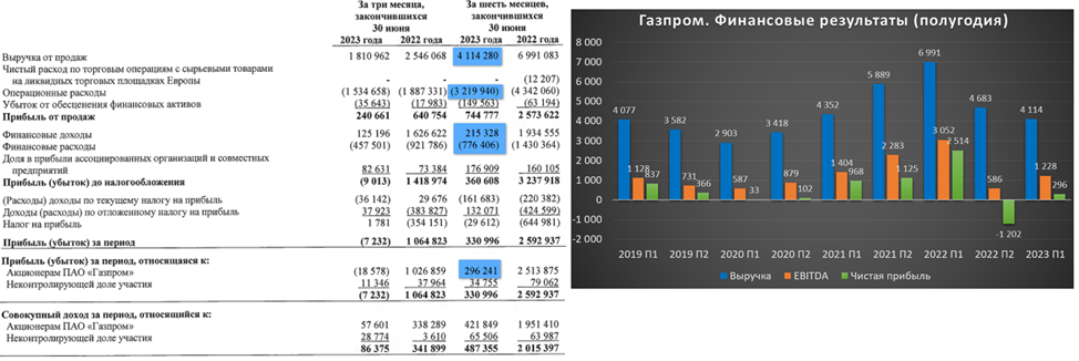 Финансовые результаты за 1П 2023 года относительно неплохие. Во многом благодаря прибыли Газпром нефти. Правда, во втором квартале Газпром зафиксировал убыток.