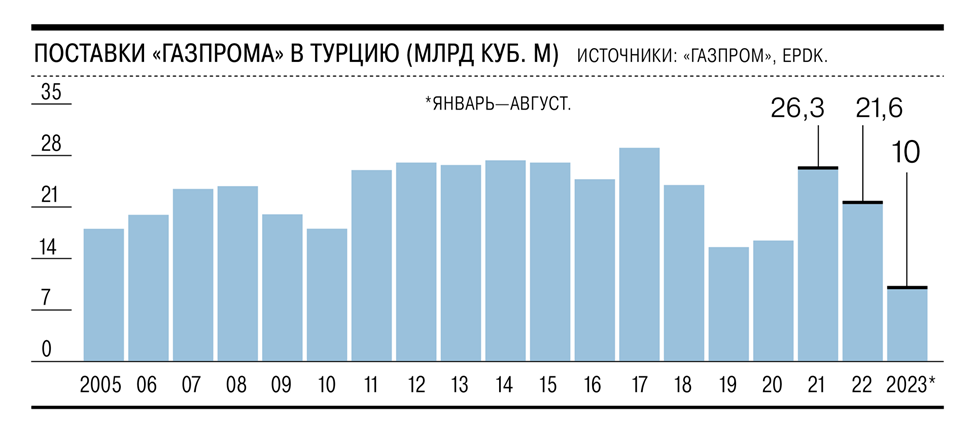 Но Турция более чем на треть сократила закупки газа из России. С января по август по турецким потокам в было поставлено 10 млрд кубометров, тогда как за весь прошлый год более 21,5 млрд. Если поставки продолжатся такими темпами, то будет обновлен антирекорд 2019 года, когда было поставлено чуть более 15 млрд. Основными причинами снижения поставок российского газа в Турцию является девальвация лиры, а также его сравнительно высокая цена, так как ценообразование по «Голубому потоку» привязано к нефти.