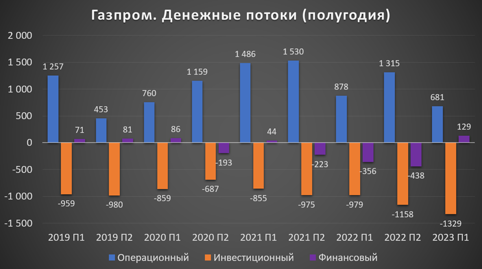 от операционной деятельности 681 млрд (-22% г/г). Именно столько денег поступило в компанию за полугодие. Это один из самых низких показателей за последние годы.